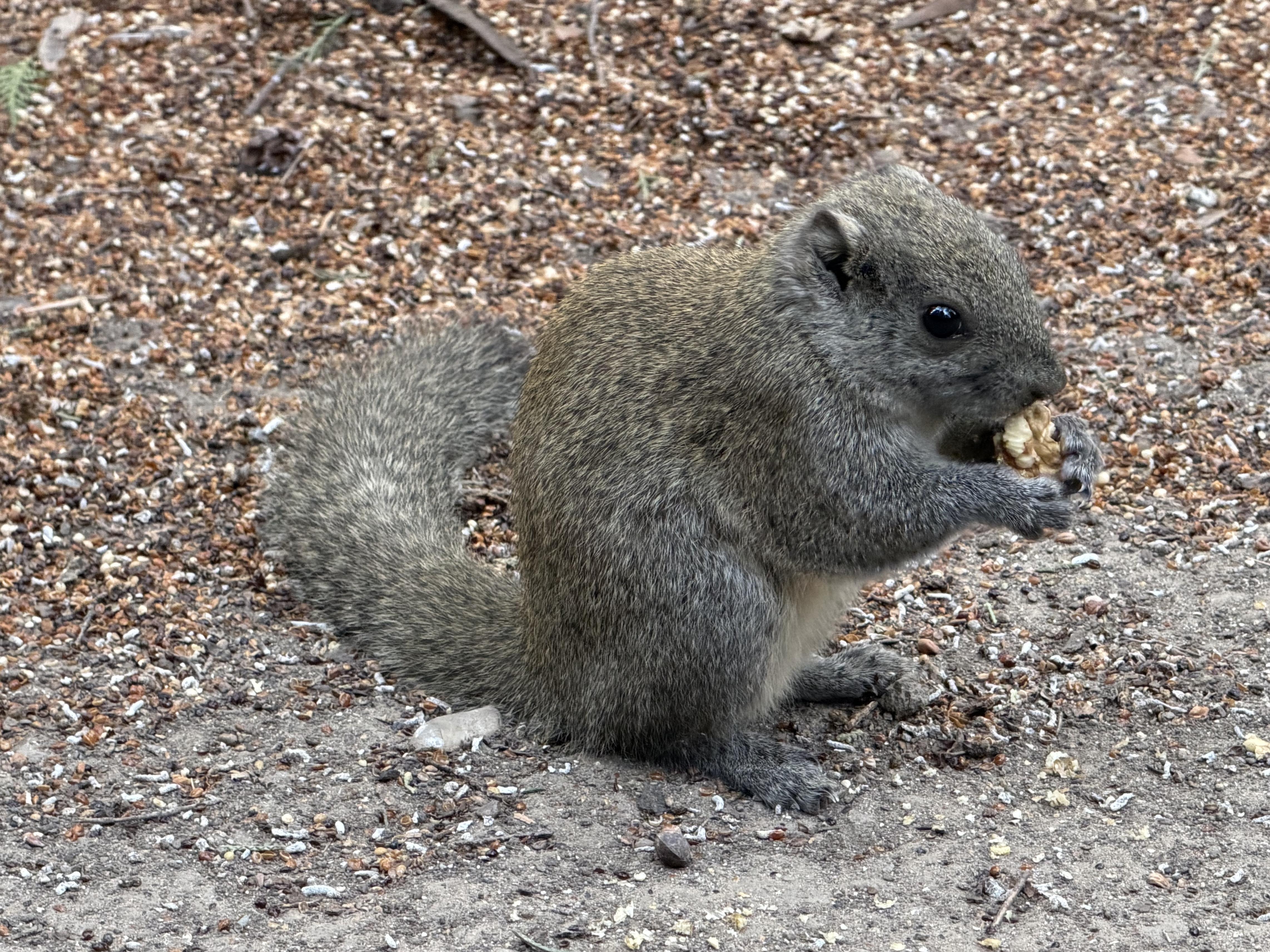 一只松鼠正在进食人类投喂的核桃仁。