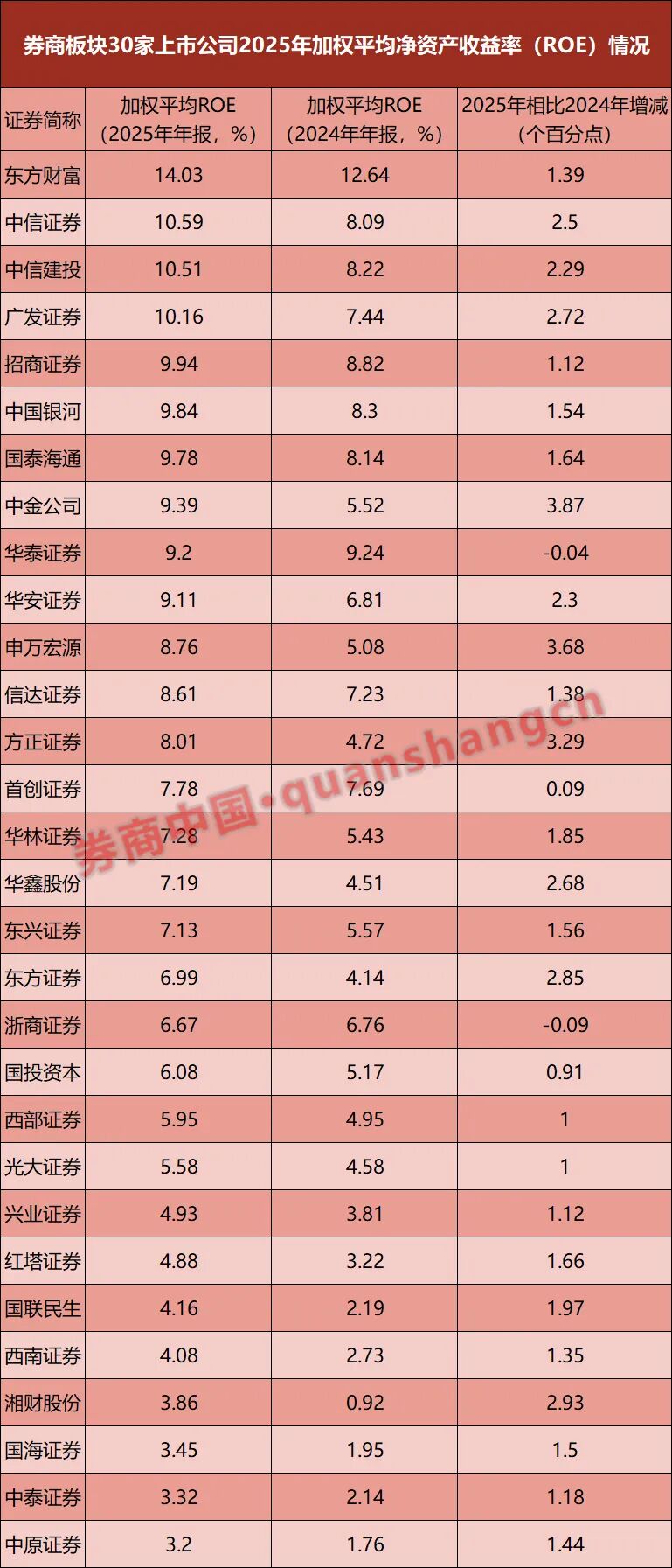 值得一提的是,从券商板块目前已披露的30家公司来看,2025年ROE的中位数约7.24%,平均数为7.35%。